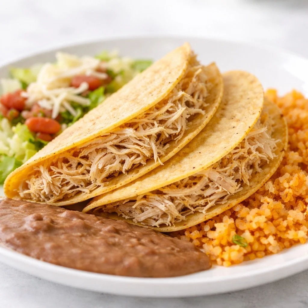 Three soſt or crispy corn tortillas filled with shredded beef, ground beef or shredded chicken. Topped with lettuce, pico de gallo & grated cheese